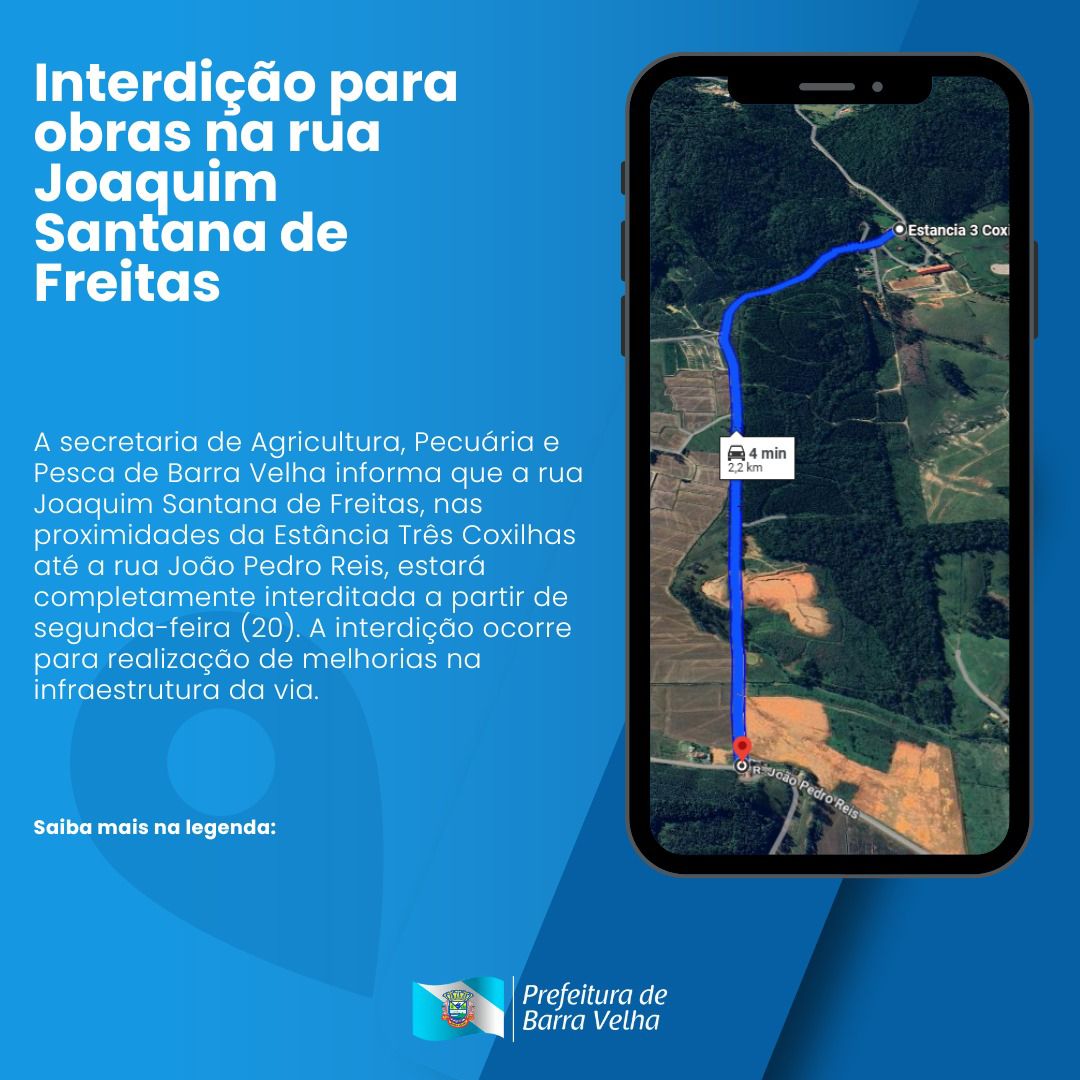A secretaria de Agricultura, Pecuária e Pesca de Barra Velha informa que a rua Joaquim Santana de Freitas, nas proximidades da Estância Três Coxilhas até a rua João Pedro Reis, estará completamente interditada a partir de segunda-feira (20). A interdição ocorre para realização de melhorias na infraestrutura da via.