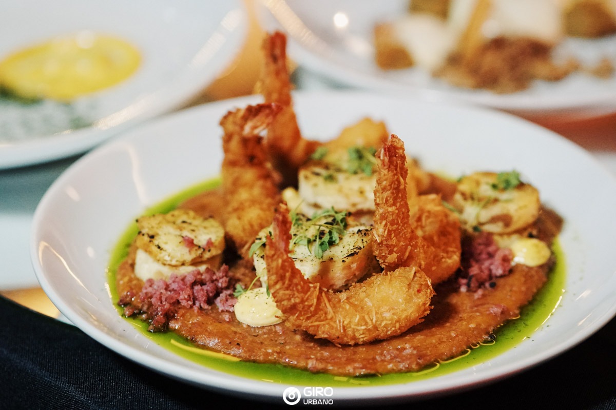 Entrada com croqueta de peixe da estação empanada em farinha de milho e mandioca, servida com maionese de maracujá. No principal, hambúrguer artesanal no brioche, queijo brie, picles de cebola roxa, tomate italiano, alface, camarão rosa empanado e maionese de manjericão com limão siciliano e pimenta dedo-de-moça.