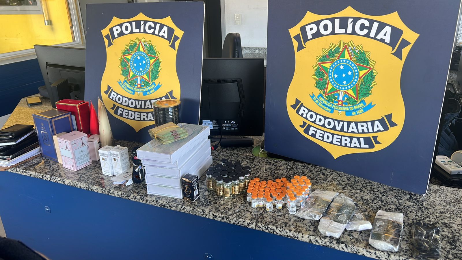 - Medicamentos: Dezenas de ampolas de anabolizantes, emagrecedores e comprimidos usados como abortivos.